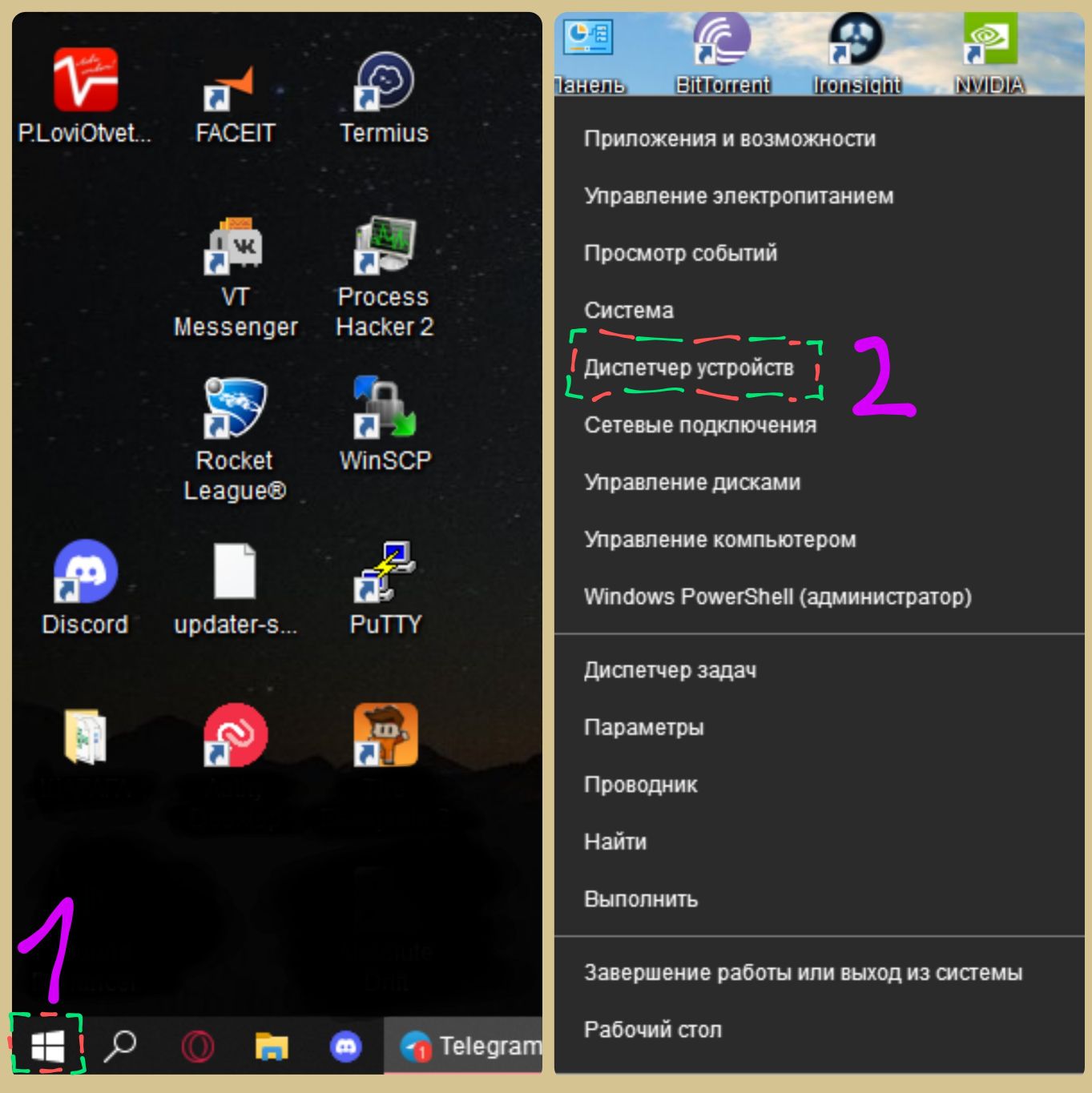 Нажимаем правой кнопкой мыши по иконке «Пуск»